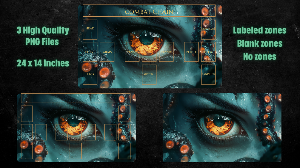 Access your files within MINUTES of purchase! This custom, digital playmat design was artfully created for the Flesh and Blood TCG. Your purchase includes 3 high resolution .png files (one with zones, labeled zones, and one without zones).
